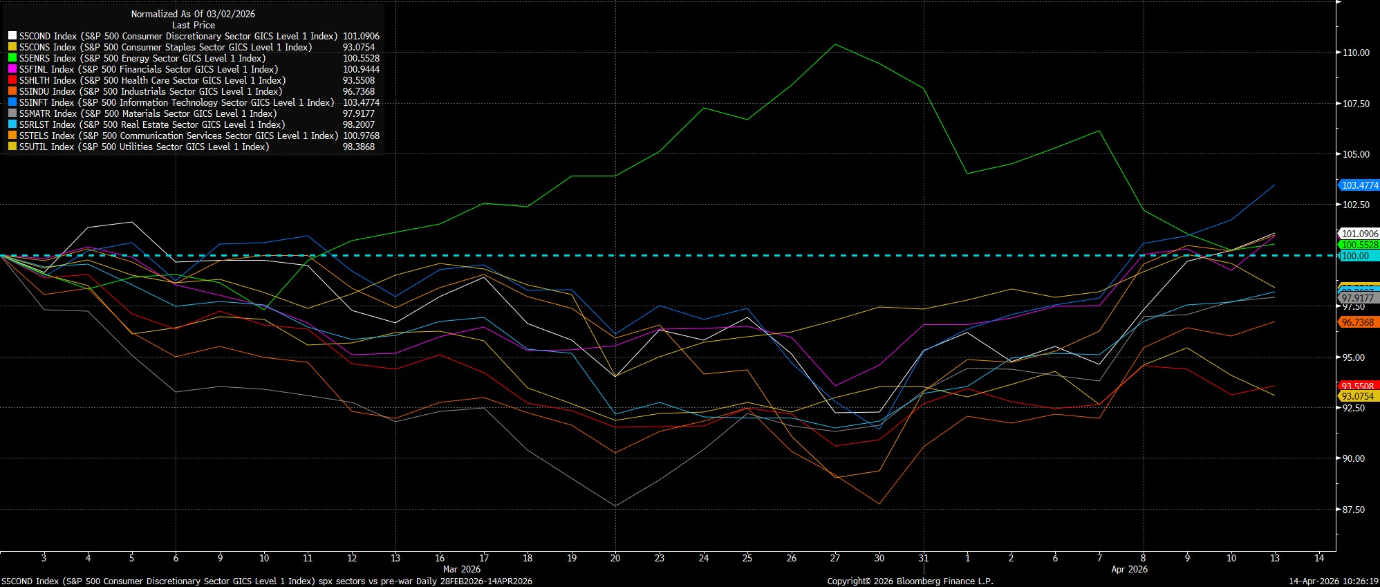 Digging a little further into things, at a sectoral level, one can see that the recent rebound in the S&P hasn’t treated all stocks equally. In fact, only five of the eleven GICS sectors (Consumer Discretionary, Energy, Financials, Information Technology & Communication Services) trade above their pre-conflict closing level.