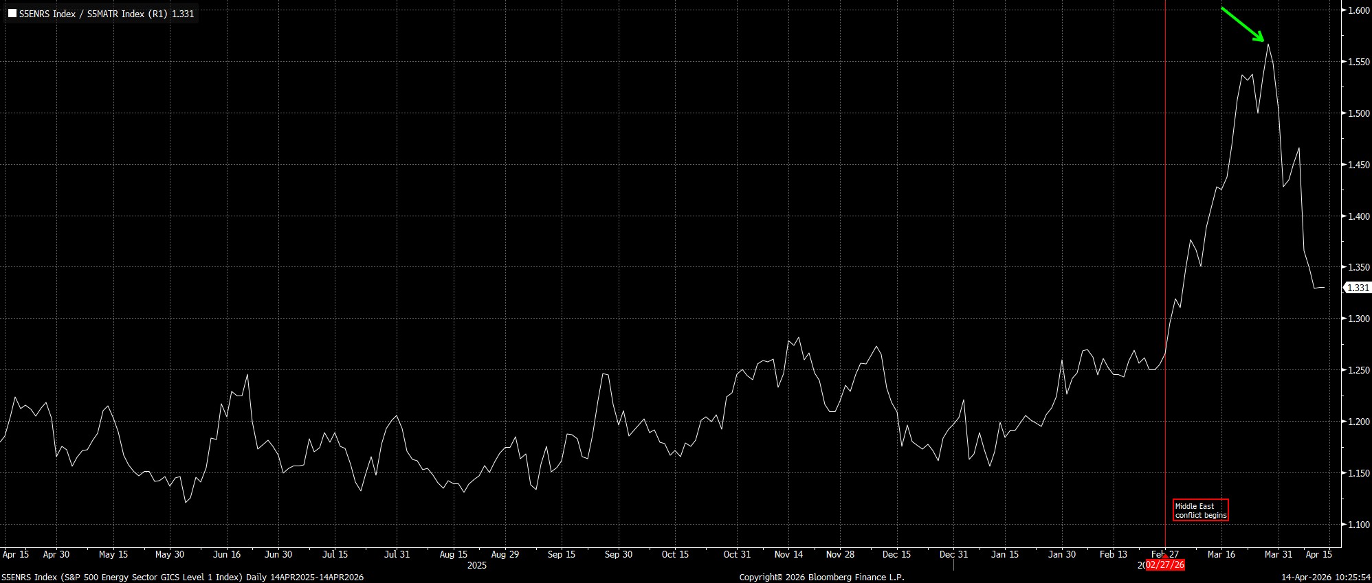 While it was only on Monday that the S&P erased its conflict-linked decline, one could argue that the equity market actually began to move past a point of ‘peak fear’ at the tail end of last month. Comparing the performance of the sector most likely to benefit from higher commodity prices caused by the conflict, Energy, with that of the sector most likely to be harmed by it, Materials, signals a dramatic reversal in sentiment since President Trump’s ‘Truth’ post noting ‘great progress’ having been made in talks with the Iranians, which in turn represented the first sliver of de-escalatory news that had been received since the war commenced.